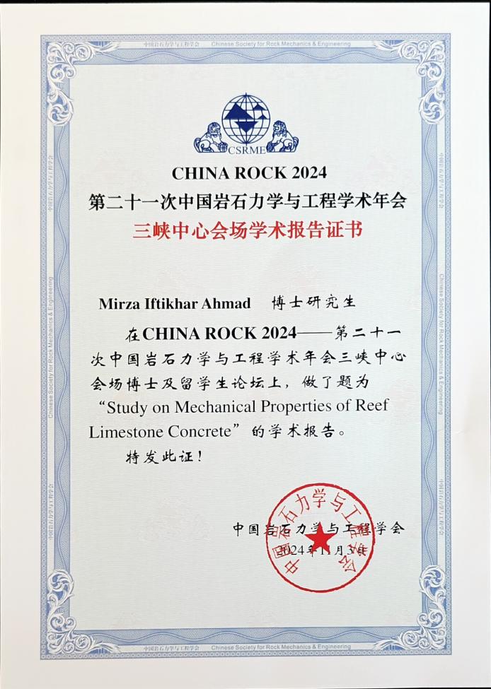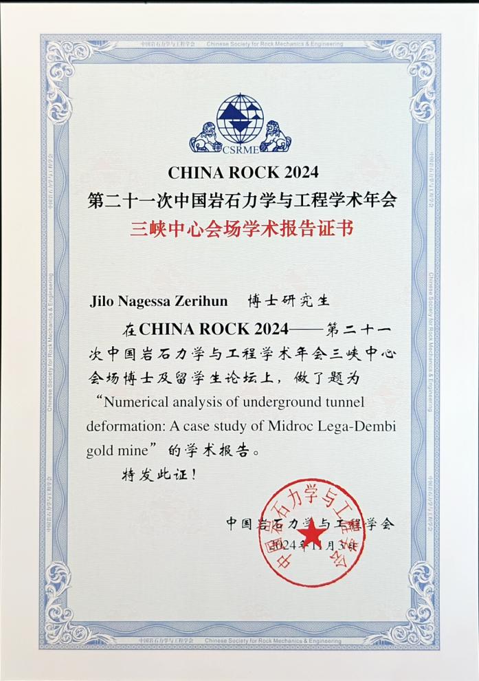 电竞盘口 罗忆研究员指导的两名留学博士研究生Mirza Iftikhar Ahmad和Jilo Nagessa Zerihun积极参与了“博士及留学生论坛”,并分别作了题为“Study on mechanical properties of reef limestone concrete”和“Numerical analysis of underground tunnel deformation: A case study of Midroc Lega-Dembi gold mine”的学术分享交流,展示了国际视野下的研究成果,进一步促进了跨文化学术交流和研究合作,提升了电竞盘口 在岩石力学领域的学术影响力。