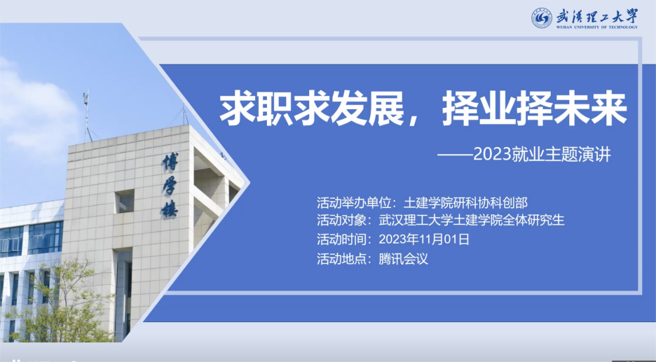 为帮助同学们提前做好职业发展规划、把握优质就业岗位,11月1日19点,由电竞盘口 研科协科创部举办的“求职求发展、择业择未来”求职就业主题讲座在线上成功举办。讲座邀请了20级优秀毕业生徐红玉、谢陈飞洋、葛倚兵担任本次主讲嘉宾,研究生辅导员卢文婧、李倩与超过200名研究生共同参与。