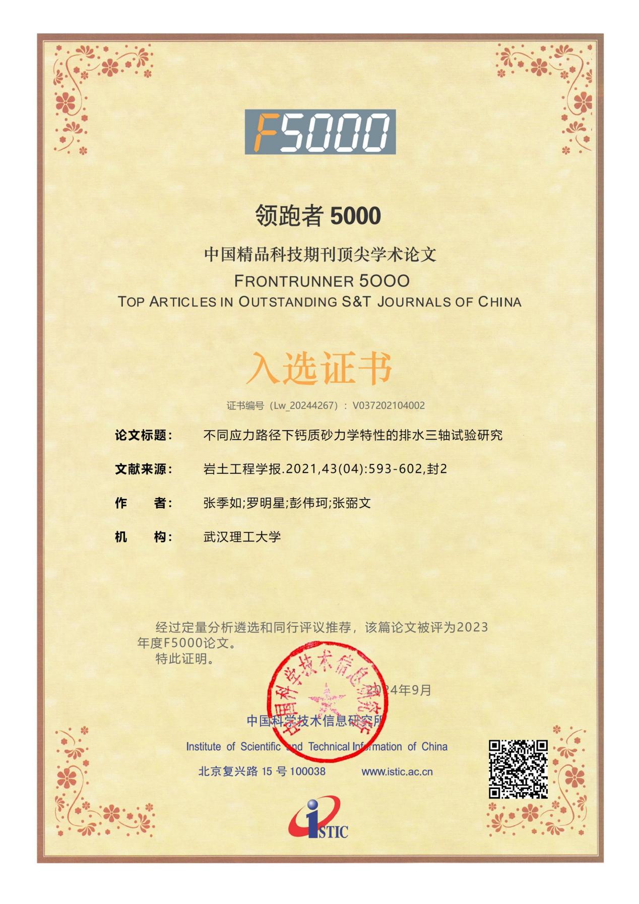 近日,国家科技部中国科学技术信息研究所(中信所)发布了2024年“领跑者5000—中国精品科技期刊顶尖学术论文(F5000)”的入选论文名单,电竞盘口 张季如教授课题组发表在《岩土工程学报》2021年第43卷4期上的论文《不同应力路径下钙质砂力学特性的排水三轴试验研究》入选2023年度F5000,论文第一作者和通讯作者为张季如教授。该文对钙质砂开展了不同应力路径下的高压三轴试验,揭示了应力路径对钙质砂变形、强度和颗粒破碎的影响规律,并探明其在不同应力路径试验中的差异除了源于砂土应力路径依附性的特性外,还来自于颗粒破碎程度不同产生的影响。