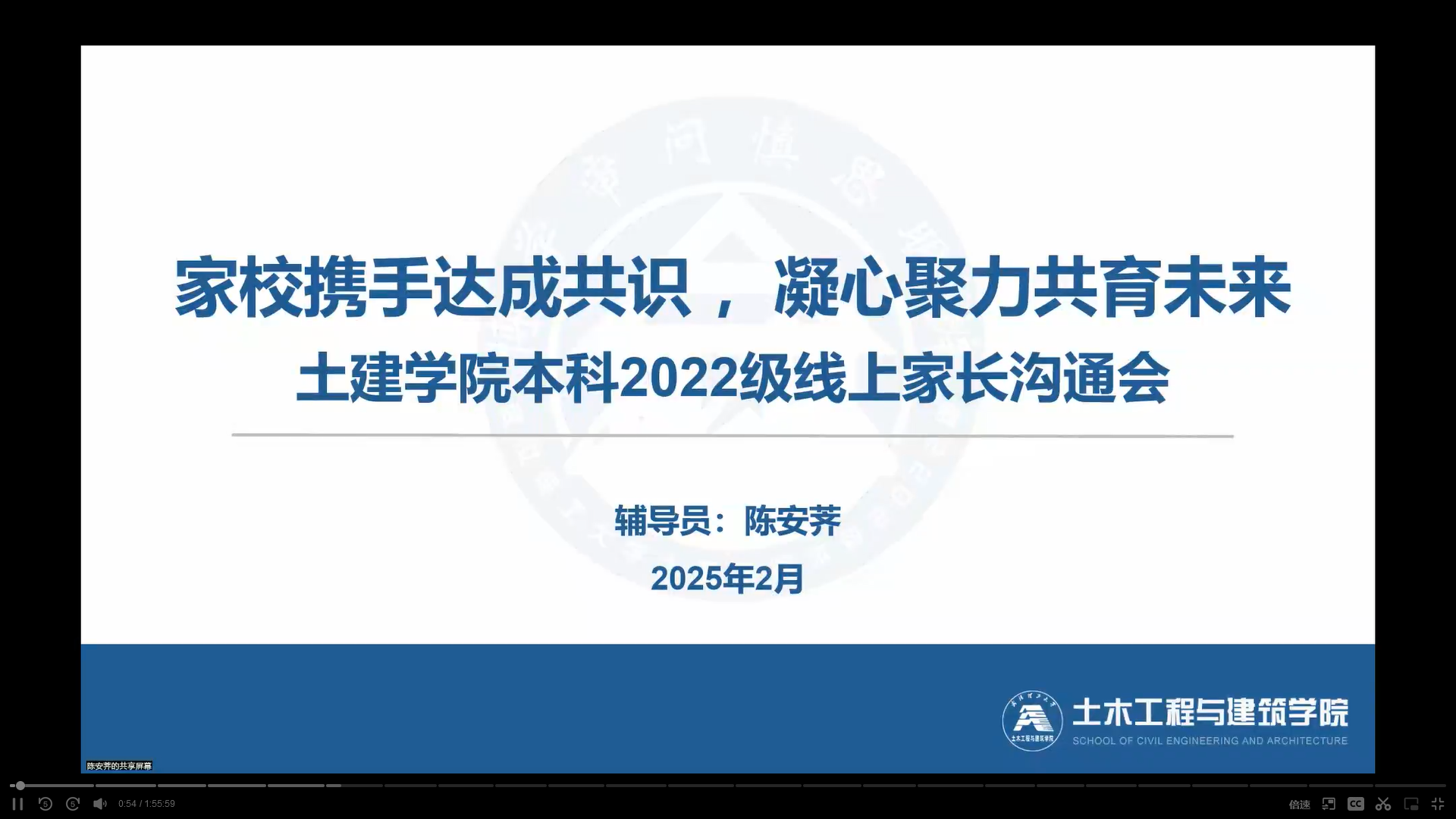 本科2022级开展以“家校携手达成共识,凝心聚力共育未来”为主题的线上家校沟通会。会议主要分为“忆往昔”“看今朝”“展未来”和“互动交流”四个板块。辅导员陈安荠主持本次会议。
