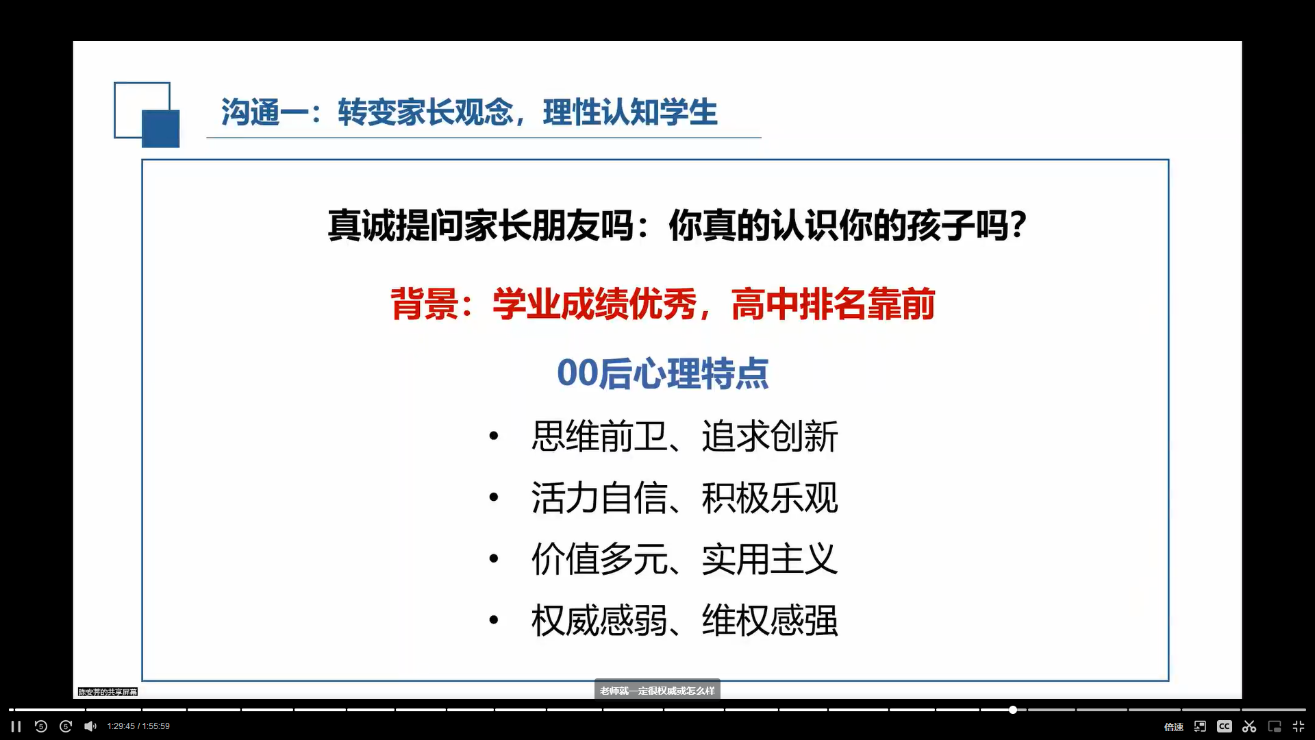 紧接着,陈老师就“转变家长观念,理性认知学生”“健康比优秀更重要,对学生合理期待”和“沟通有方法,放下唯我独尊”三个主题与家长交流,指出关注学生心理健康的重要性,希望家长尊重学生的个人意识,引导学生做自己人生的第一责任人。并就家长与学生沟通困难的问题,分享了家长与孩子可行的沟通方式和方法。