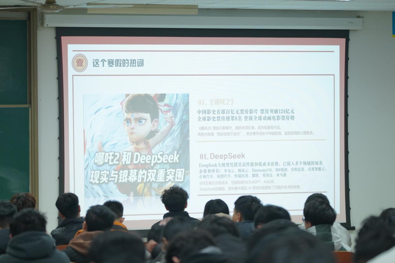 陈老师首先分析了寒假期间引发热议的国产动画《哪吒2》与人工智能大模型DeepSeek,提出了抗挫力和长期主义两个关键词。他指出,《哪吒2》导演饺子用十年磨一剑的专注力,凭借为数不多的几部作品在动画领域取得了惊人成就,将中国动画推向了百亿票房新高度。而这个过程中饺子导演也经历了许多挫折,付出了很多努力。陈老师以此来教导同学们要坚持目标,即使面对挫折也要勇往直前。