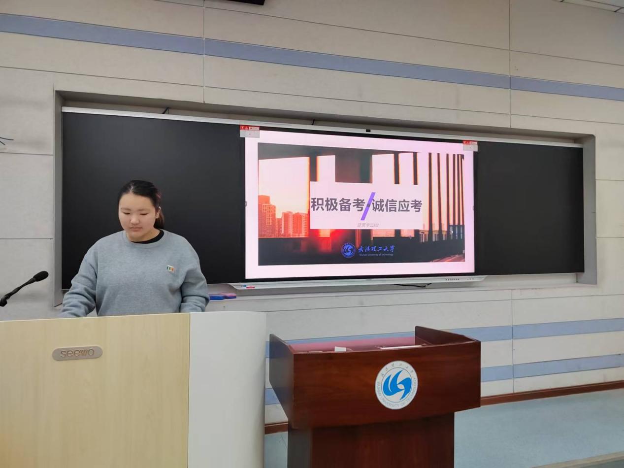 为营造积极向上的学习氛围,加强同学们的诚信意识,12月11日下午4点到4点半,建筑学2202班在新三104以“积极备考,诚信应考”为主题开展了班会活动。本次班会由班长余心瑷同学主持。