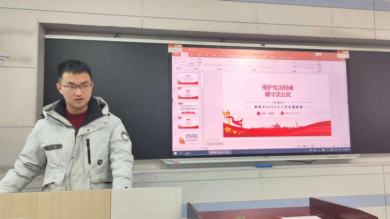 为了深入学习贯彻党的二十大精神,增强团员青年宪法意识和法治观念,12月18日,建筑学2201团支部在新三109教室开展了“维护宪法权威,做守法公民”主题团课活动。