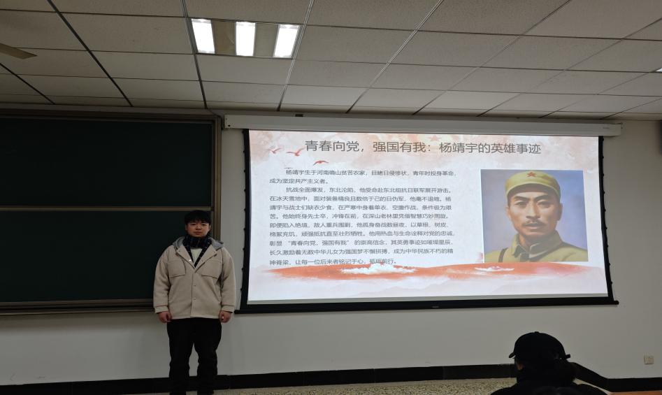 罗简越同志分享了英雄人物杜富国同志的光辉事迹。她说,“在青春路上,杜国富同志以无畏勇气与奉献精神诠释了‘青春向党,强国有我’,激励无数青年为民族复兴奋勇拼搏。”接着,何琦璇同志介绍了英雄人物陈祥榕。陈祥榕同志用生命诠释对党忠诚,彰显“青春向党,强国有我”的豪迈担当,其事迹如璀璨星辰激励着无数热血儿女为祖国安宁与繁荣不懈拼搏,在新时代的征程中续写英雄荣光。最后,秦宇戈同志分享了杨靖宇英雄人物的历程。杨靖宇同志用热血与生命诠释对党的忠诚,彰显 “青春向党,强国有我” 的崇高信念,其英勇事迹如璀璨星辰,长久激励着无数中华儿女为强国梦不懈拼搏,成为中华民族不朽的精神脊梁,让每一位后来者铭记于心,砥砺前行。