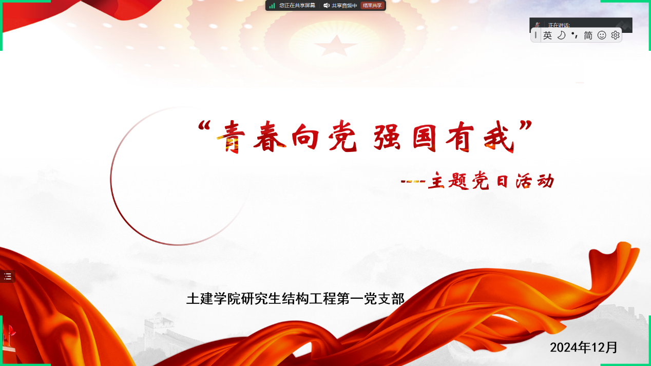 为进一步激发支部党员及入党积极分子的爱国情怀和奋斗精神,坚定理想信念,12月10日晚19时,电竞盘口 研究生结构工程第一党支部在腾讯会议平台举行了主题为“青春向党,强国有我”的党日活动。此次活动由党支部副书记潘志峰主持,吸引了包括党员和入党积极分子在内的78人参加,在线上深入开展了思想交流与学习讨论。